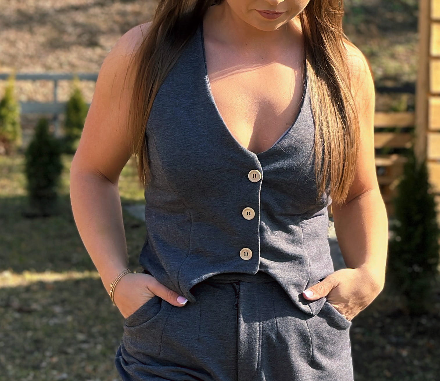 Perfekcyjny krój - wysoki stan spodni przepięknie podkreśla talię, szeroka nogawka i zaszewki idealnie profilują nogę, nie poszerzając nas przy tym. Wygodne kieszenie oraz gwiazda, która dopełnia całość - kamizelka. Szyta z podwójnej warstwy, przepięknie wyprofilowana, również podkreślająca talię pozwala się nosić na koszulę/bluzę lub solo, jak na prezentowanych zdjęciach.