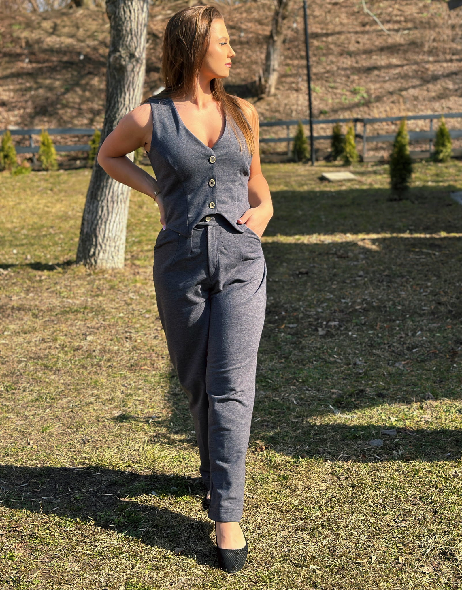 Ten damski garnitur z wysokim stanem pięknie podkreśla talię i sylwetkę, a dopasowana kamizelka dodaje mu wyjątkowego charakteru. To połączenie klasyki z nowoczesną swobodą - idealne zarówno na dzień w biegu, jak i stylowe wyjście.